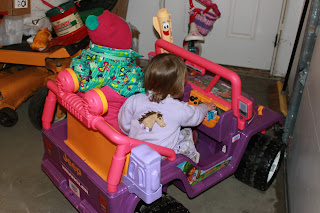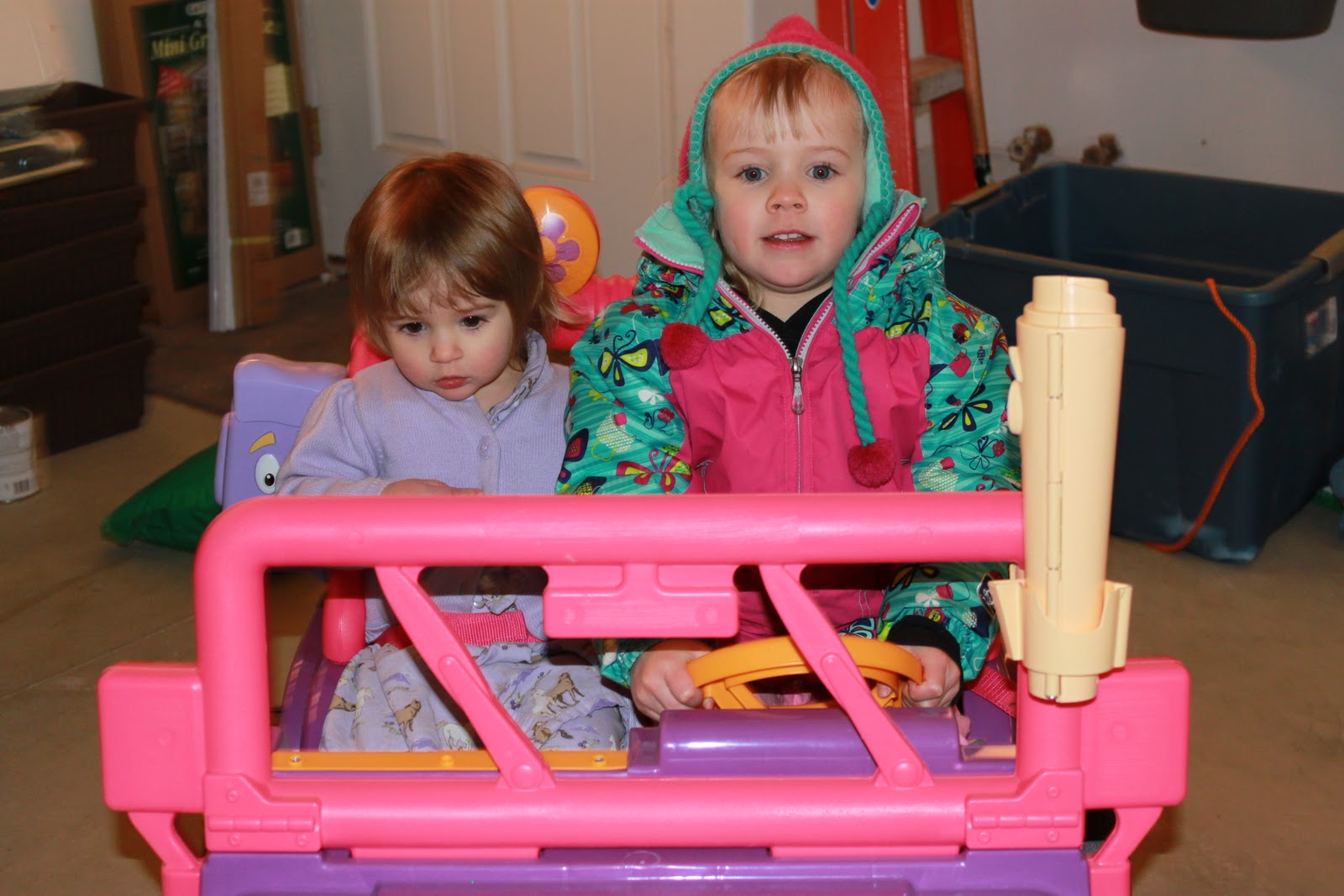 Miss E was wearing her coat and hat in case she got outside for her adventure. Anika never wants a coat on or shoes. That is a problem for a girl being raised on the frozen prairie. Thankfully our garage is heated. It feels like a North Dakota fall day in there. She went coatless and hatless.