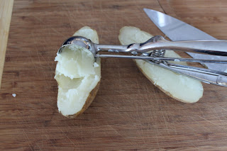 Slice your microwave baked potatoes and clean out most of the inner flesh, placing in a bowl. The skins can be placed on a cookie sheet.