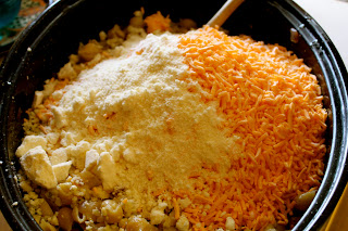 Comfort food made by my mom relaxes and unwinds me like the above homemade mac and cheese we are about to eat for lunch. Oh and the Peanut Butter Fudge Pie she is making is comfort food too which assured me my weight loss kick off is not starting this weekend.