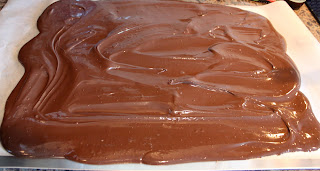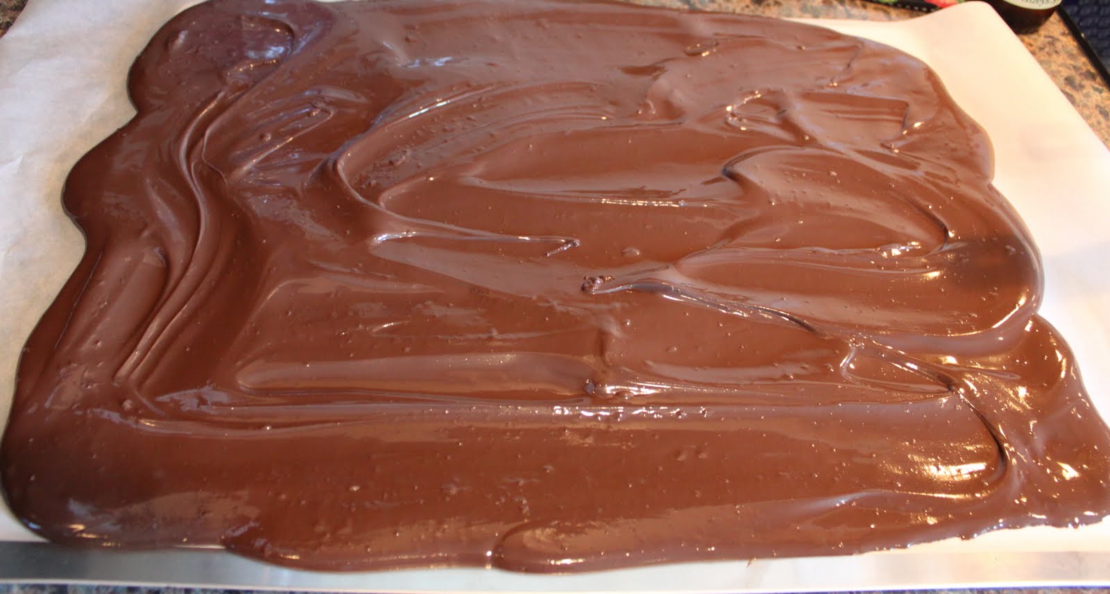 Quickly spread melted chocolate on prepared baking sheet, either lined with wax or parchment paper.