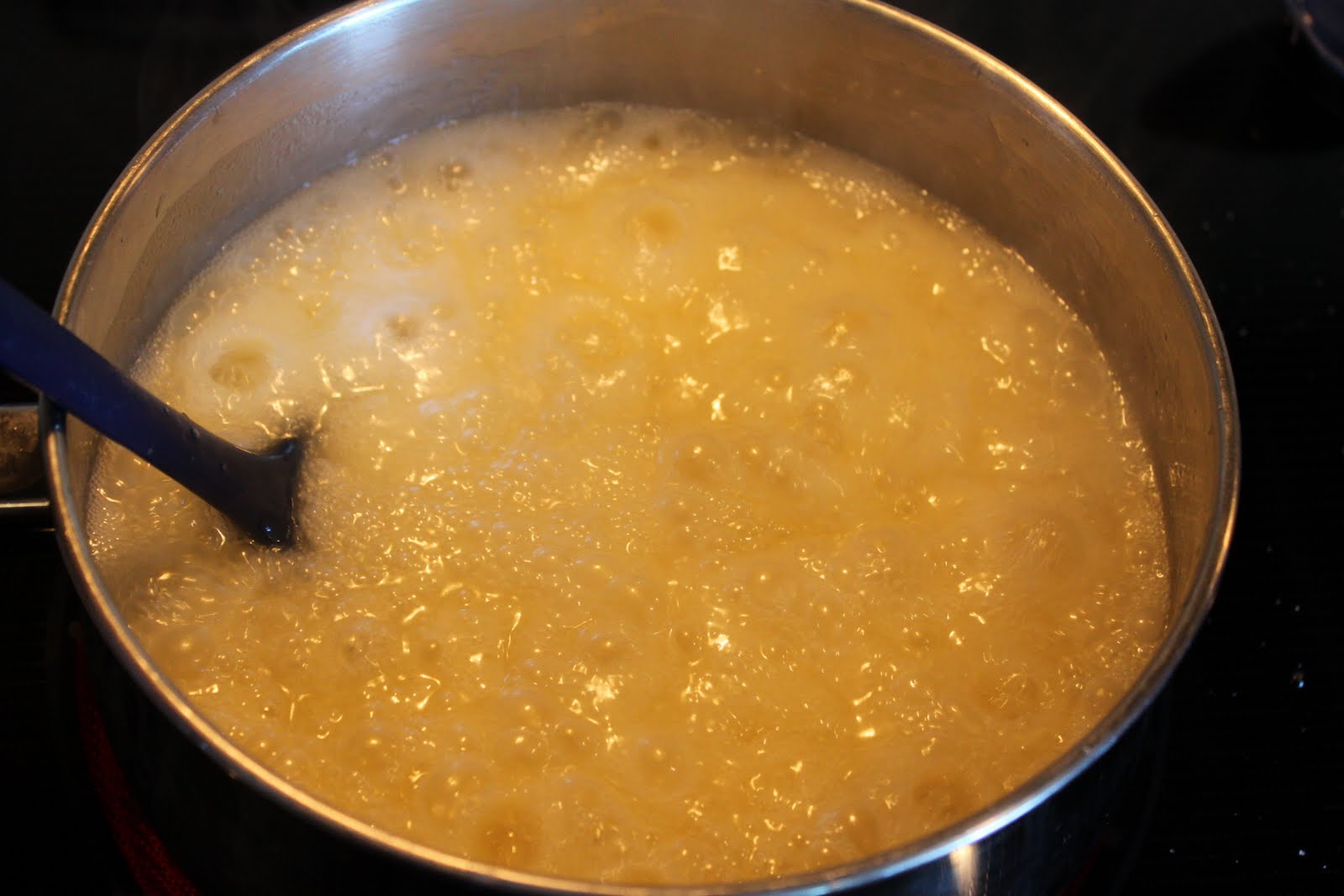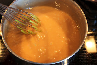 Continuously stir while the mixture emulsifies. Use a candy thermometer to reach 300-320F. I did the eyeball technique of no candy thermometer until the mixture reached a golden brown color and thick mixture. I also timed it for 11 minutes and it worked.