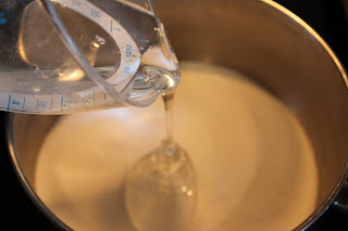 Add 2 cups of white sugar with 1/2 cup of water and 1/2 cup of light corn syrup to large saucepan.