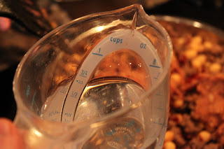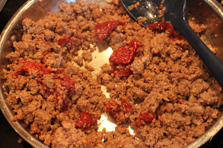 Add 3/4 cup of water and stir. Simmer meat mixture on low.