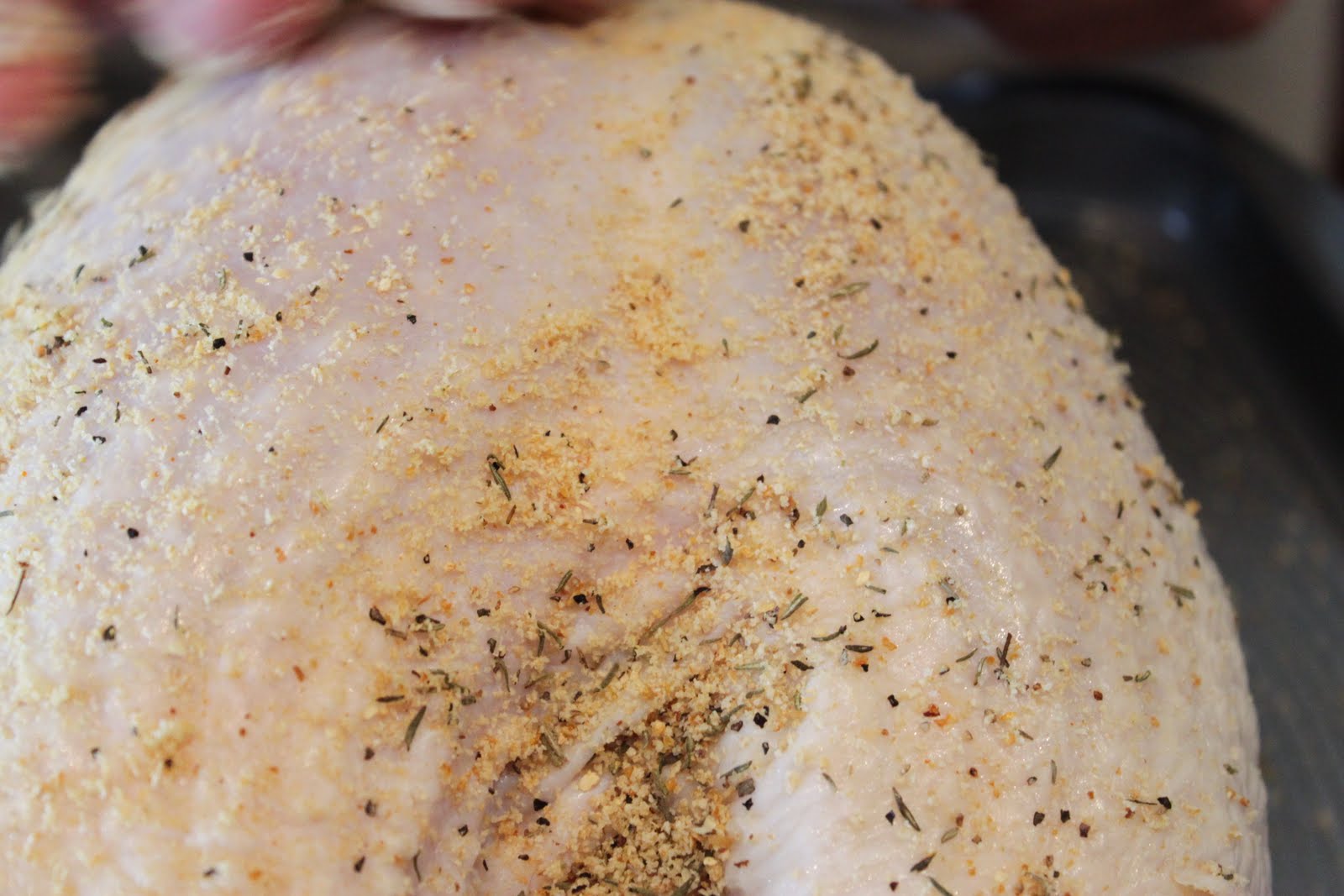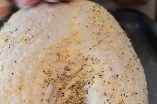 rub down a thawed turkey with some canola oil and spices, stuff it with an onion,