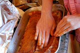 The ribs are slowly cooking on the grill right now with smoking hickory wood with my husband the Grill Master overseeing them.