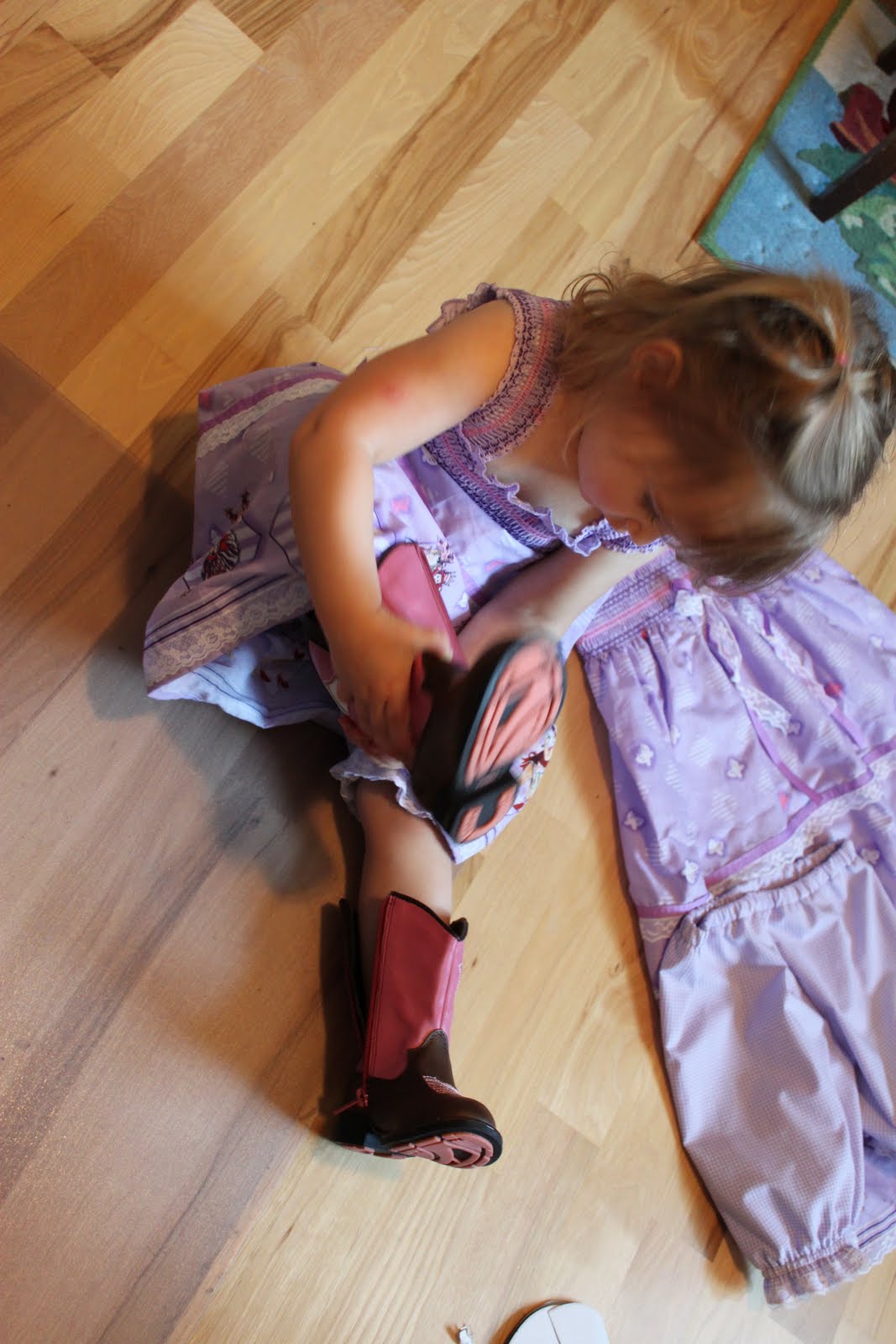 But Miss A is pleased as punch to never take this Fancy Nancy dress and her light up cowgirl boots off.