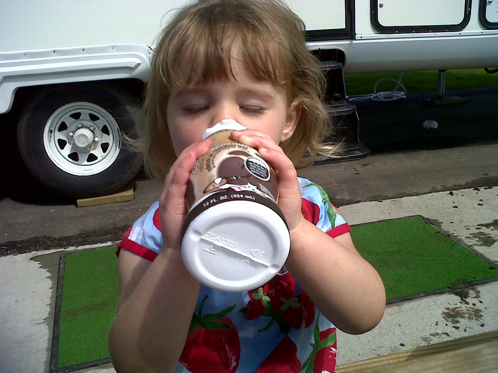As she was drinking it sitting on the picnic table outside our camper, I snapped a picture of her on my phone.