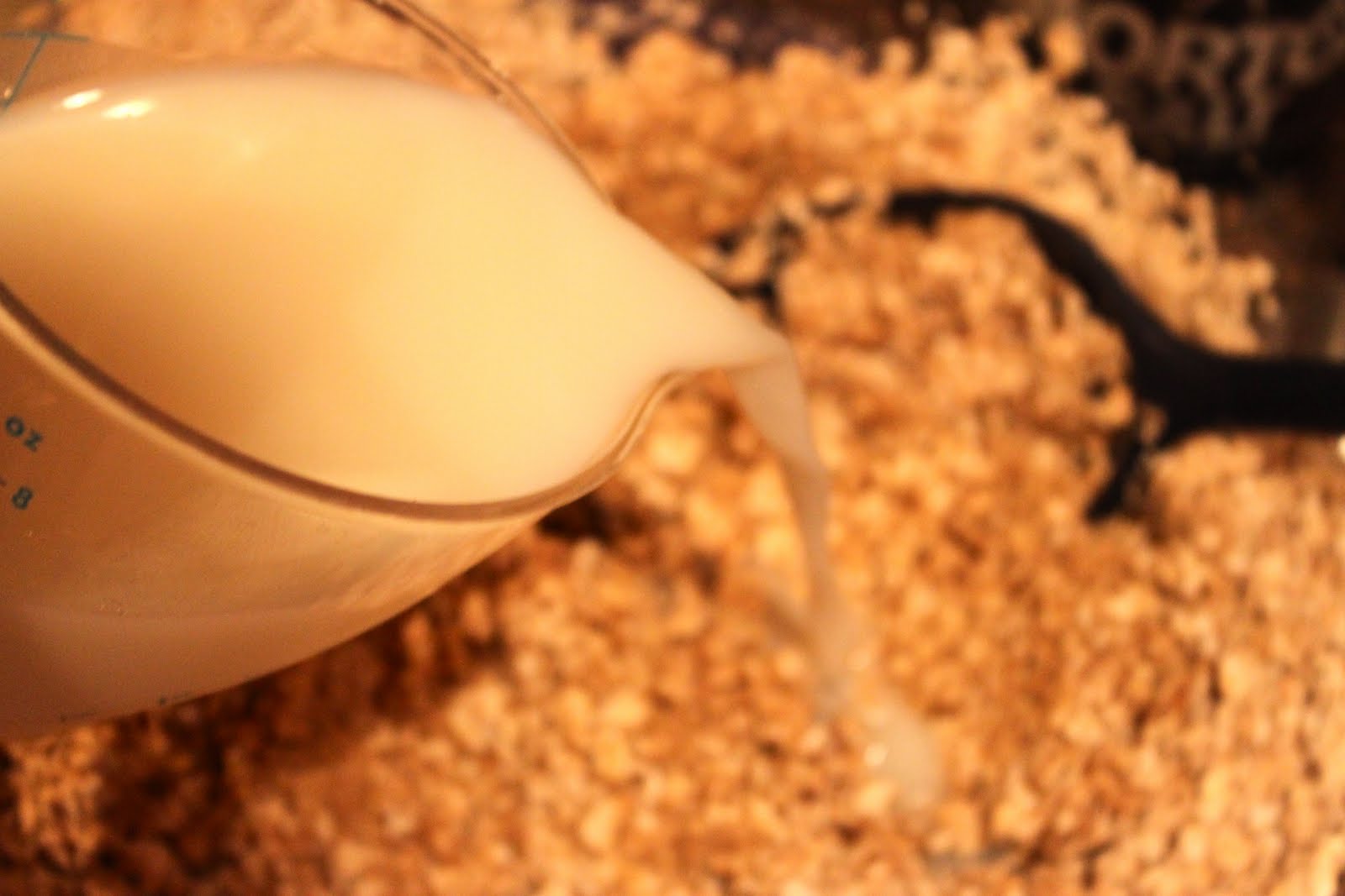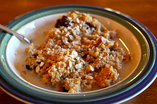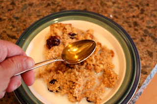 When the Brown Sugar Baked Oatmeal was done, I spooned up bowls for my husband, son and myself, putting a tsp of honey and a little milk on each helping.