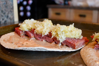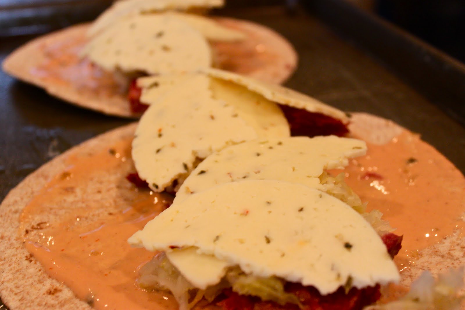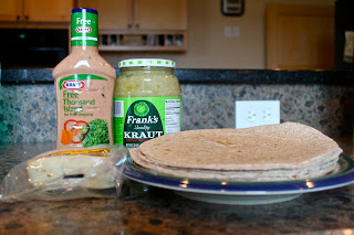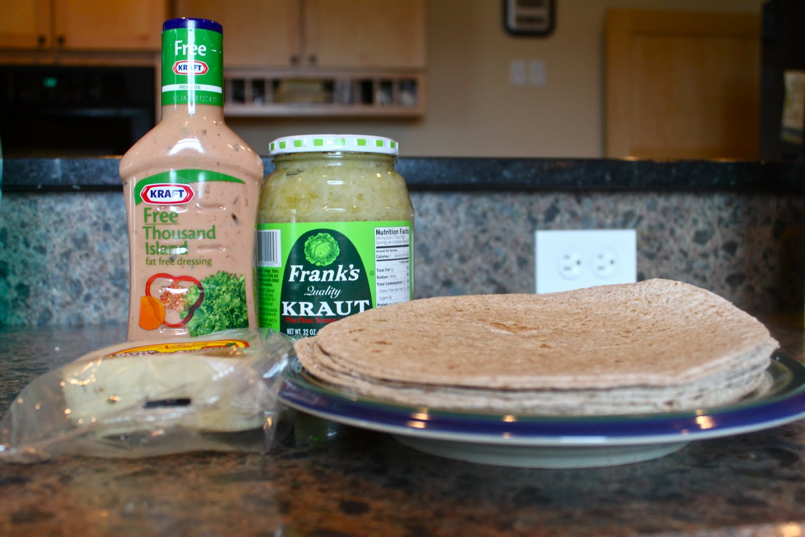 I spread a thin layer of fat-free Thousand Island dressing on the wrap, topped the sliced corned beef with sauerkraut and cheese and wrapped up, placing on a baking sheet.