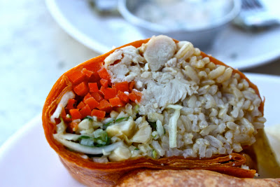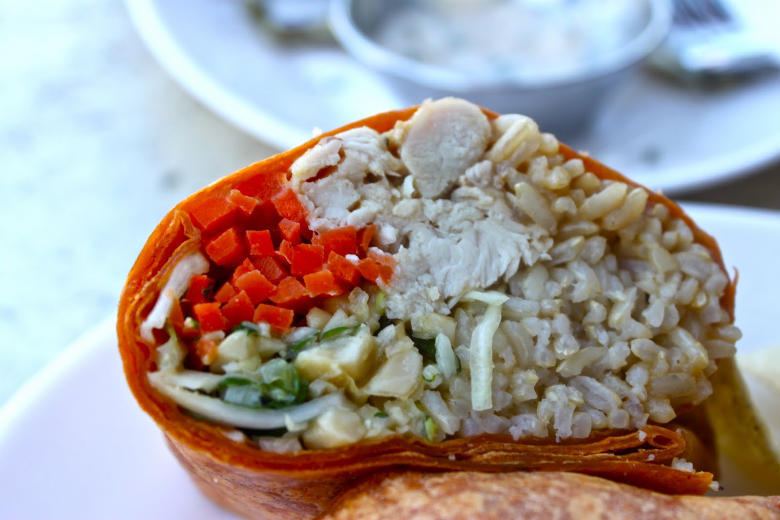 I chose a Thai chicken wrap, recommended by Laura, who normally gets it with tofu instead of meat. She didn’t know where the tofu comes from, nor the chicken but she trusts tofu over chicken.