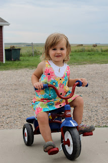 Now nap time is over and we’re off the enjoy the afternoon outside where Miss A is learning to pedal with a skirt on and Miss E thinks she should be able to ride the new John Deere riding lawn mower by herself.