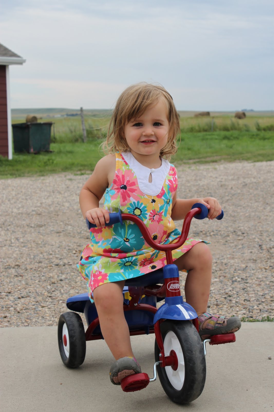 Now nap time is over and we’re off the enjoy the afternoon outside where Miss A is learning to pedal with a skirt on and Miss E thinks she should be able to ride the new John Deere riding lawn mower by herself.