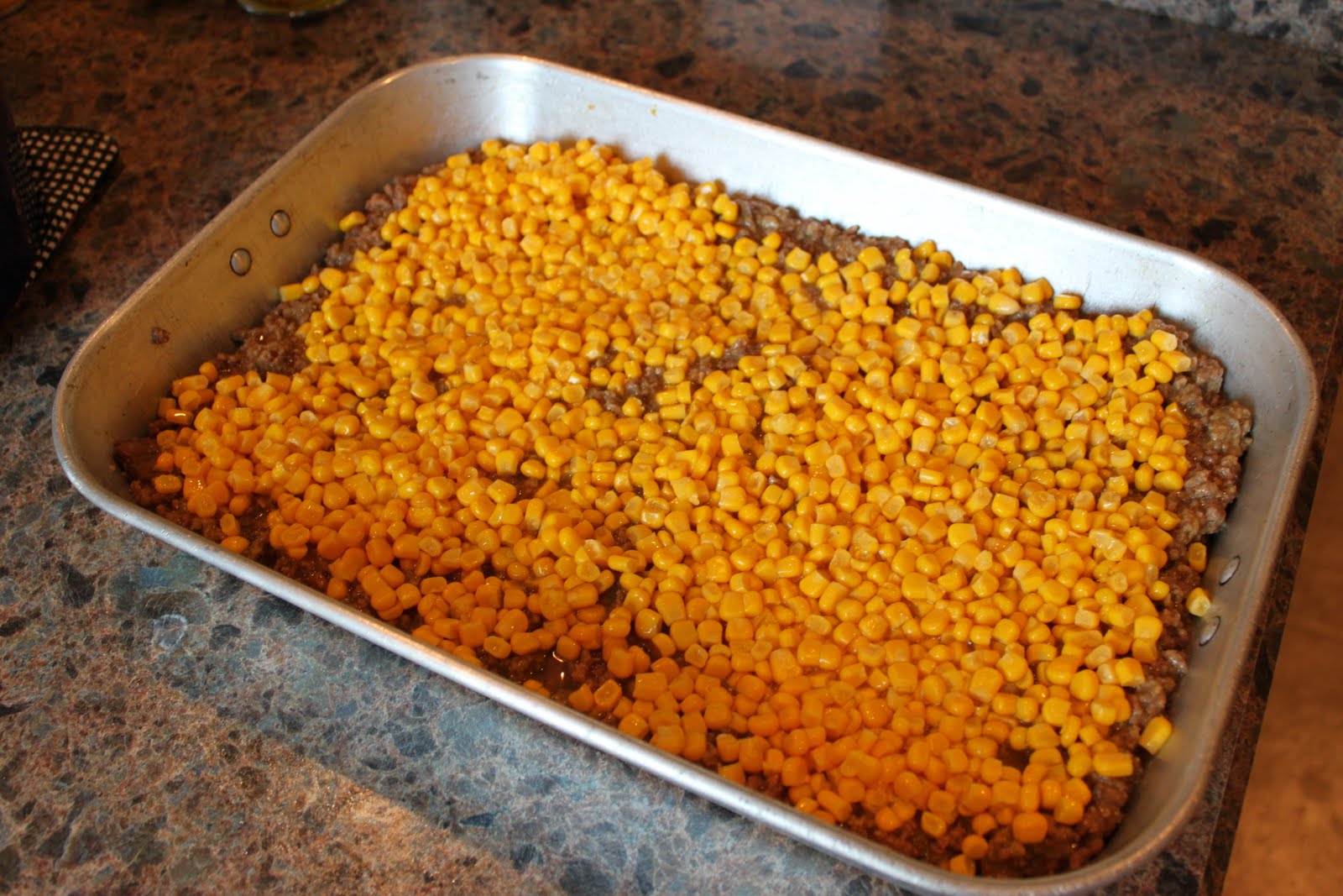 Mix together ground beef and soup; spread in an ungreased 9×9 pan. I doubled the recipe so you’ll see I used a larger pan.
