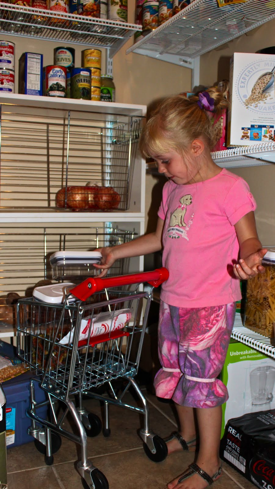 Miss E has a shopping cart and goes grocery shopping in our pantry. But after seeing her “drive” herself around with her groceries on the stairway, I thought it was time I took the girls shopping, prairie style.
