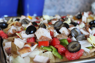 I mix in pita chips with tortilla chips on a jelly roll pan and decorate them with the layers of tomatoes, peppers, chopped artichoke hearts, sliced meat, cheese and olives.