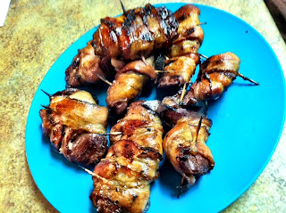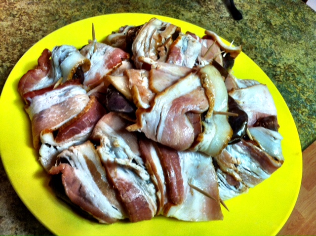 Stick each breast half a few times with the injector and then it’s bacon time. Yup, bacon. I wrap each fillet in a piece or two of bacon and hold it in place with a few strategically placed toothpicks.