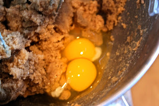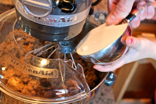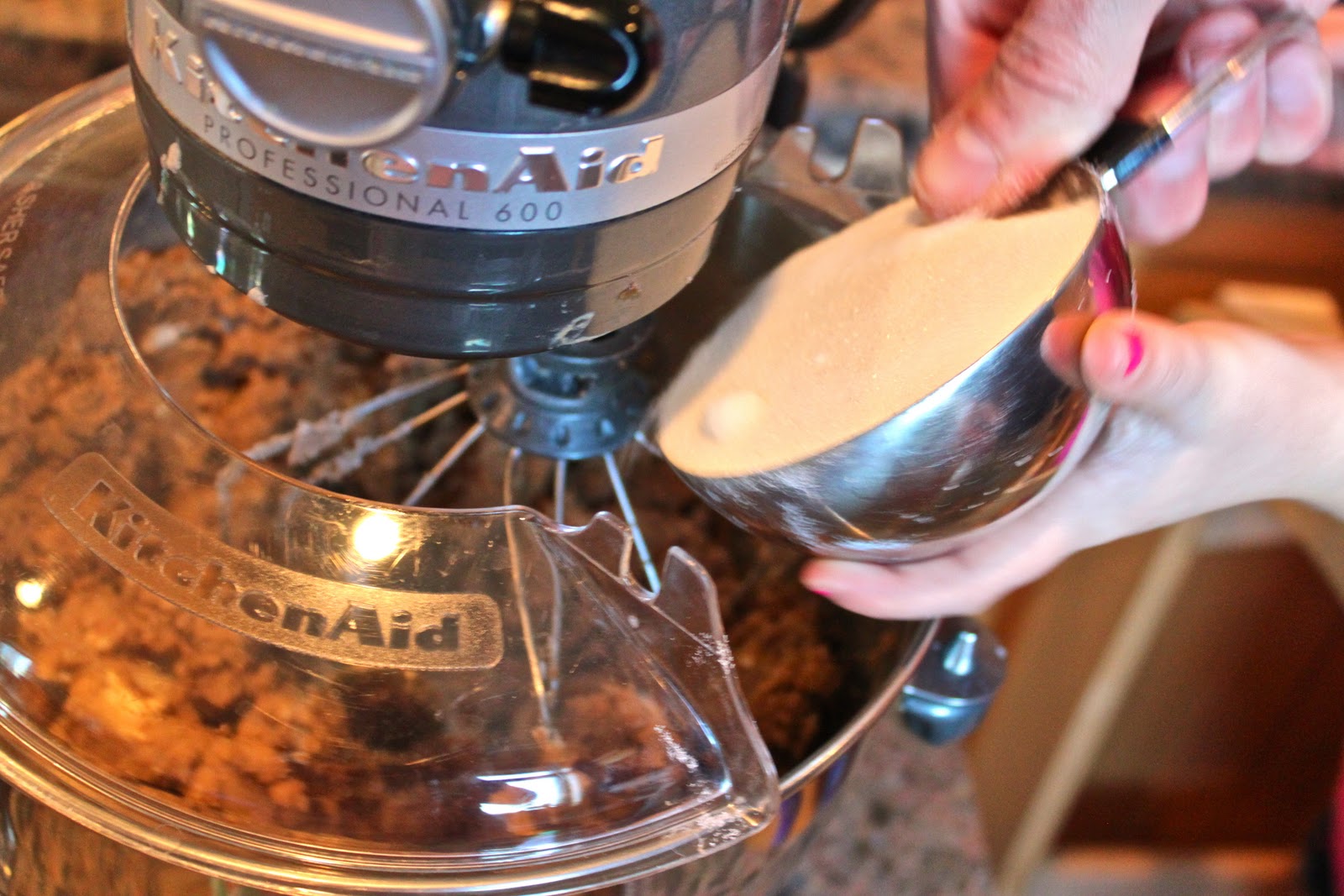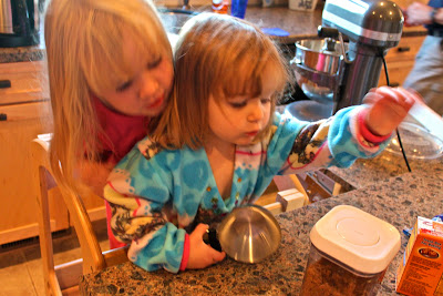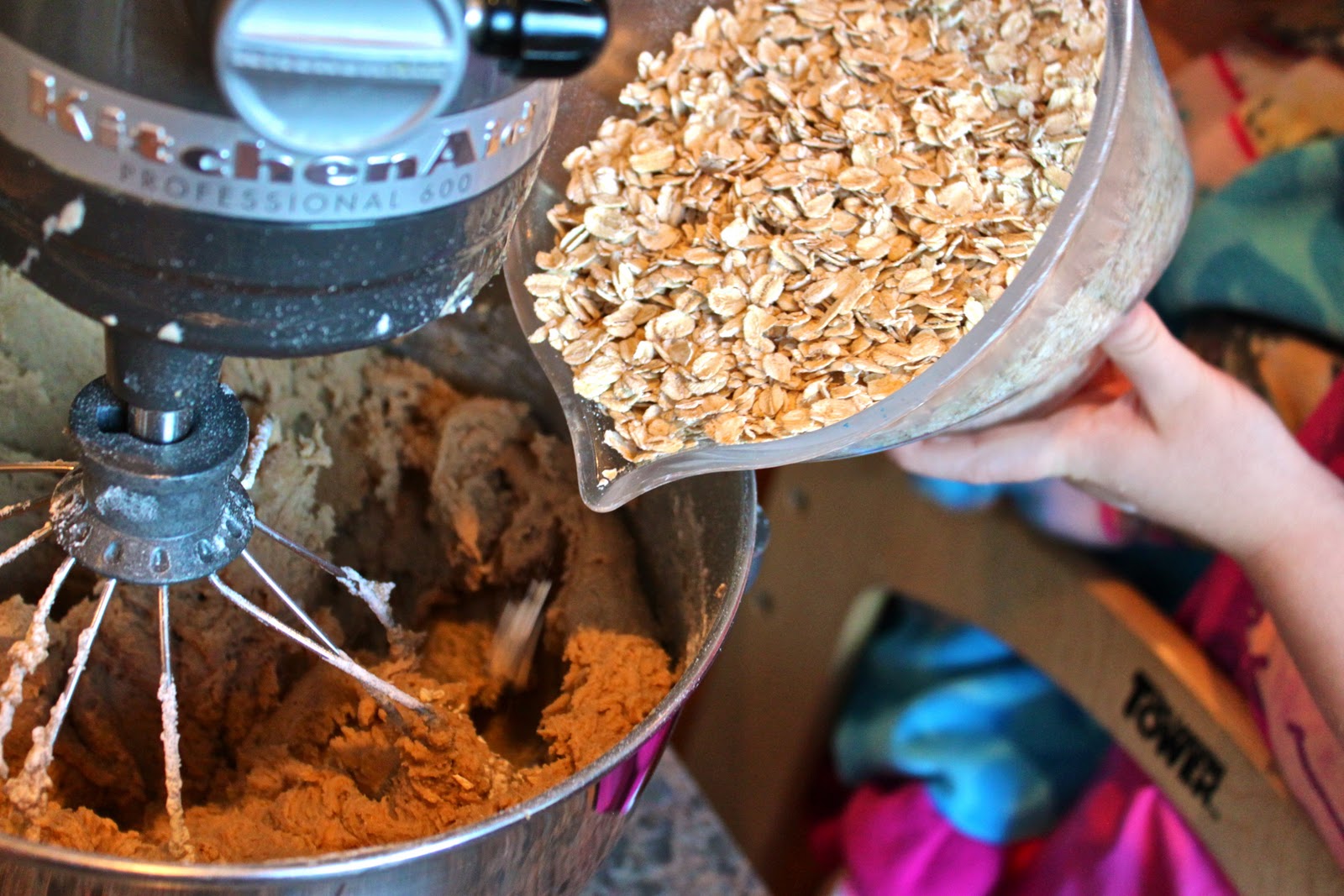 I added 1 tsp of pumpkin pie spices for added “fall” flavor and it was a good addition to the cookies. Add the pumpkin pie spice to the baking soda, salt and flour and sift together. Daddy sifted with the girls.