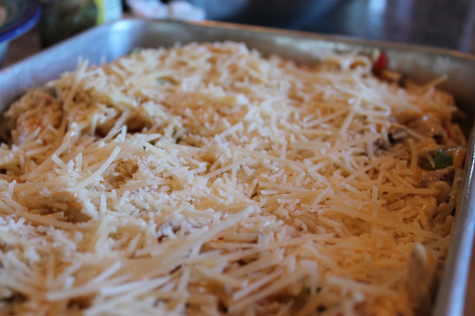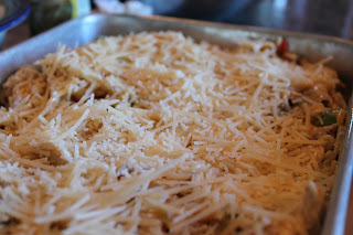 12. I ran out of shredded cheddar cheese and sprinkled parmesan on the top of the pan before baking. You can add the remaining 1/2 cup of shredded cheddar cheese. Bake at 350F for 35-45 minutes until golden and bubbly.