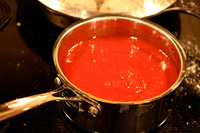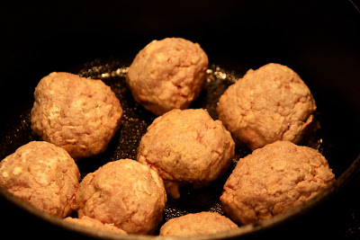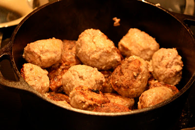Once the meatballs have browned for about 5-7 minutes, I pour over the sauce, stir and cover, placing them in the 375F oven.
