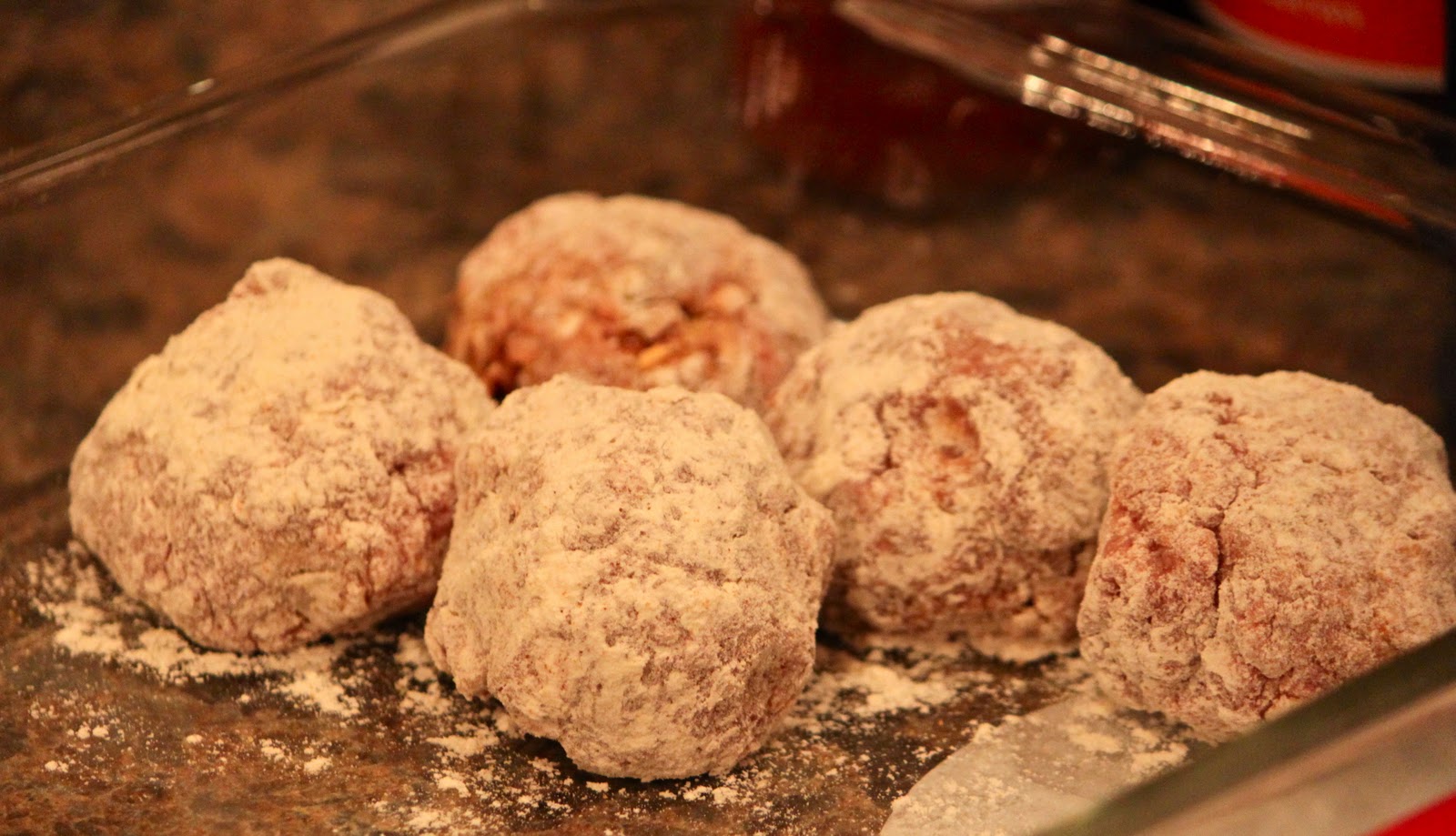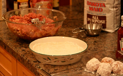 In a shallow pan, add 1/2 cup flour with 1 tsp. season salt. Make medium sized meat balls from your meat mixture and gently roll each in the flour mixture.