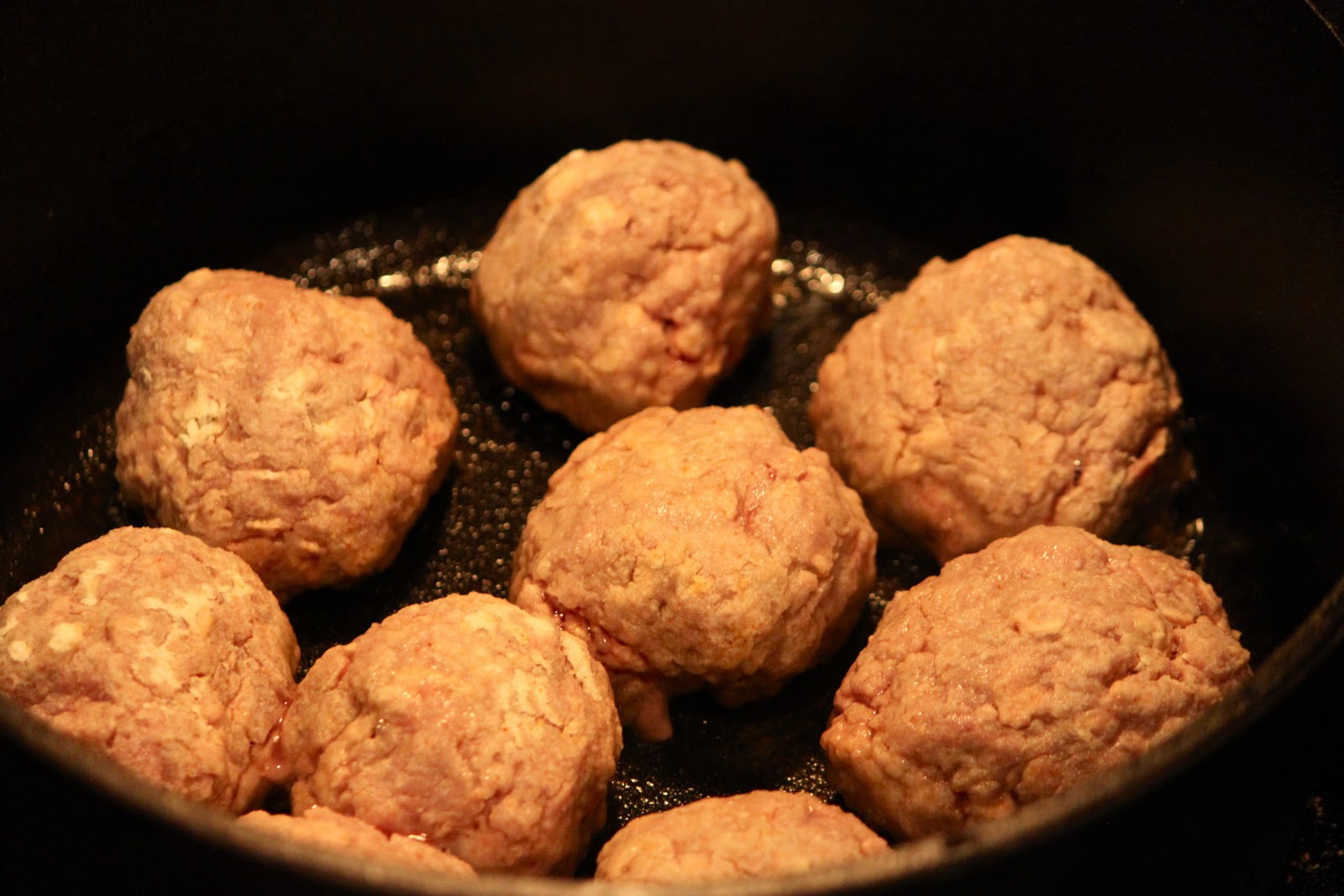 On the stove top, over medium heat have a dutch oven or cast iron pan to brown the meatballs with the canola oil at the bottom of the pan.
