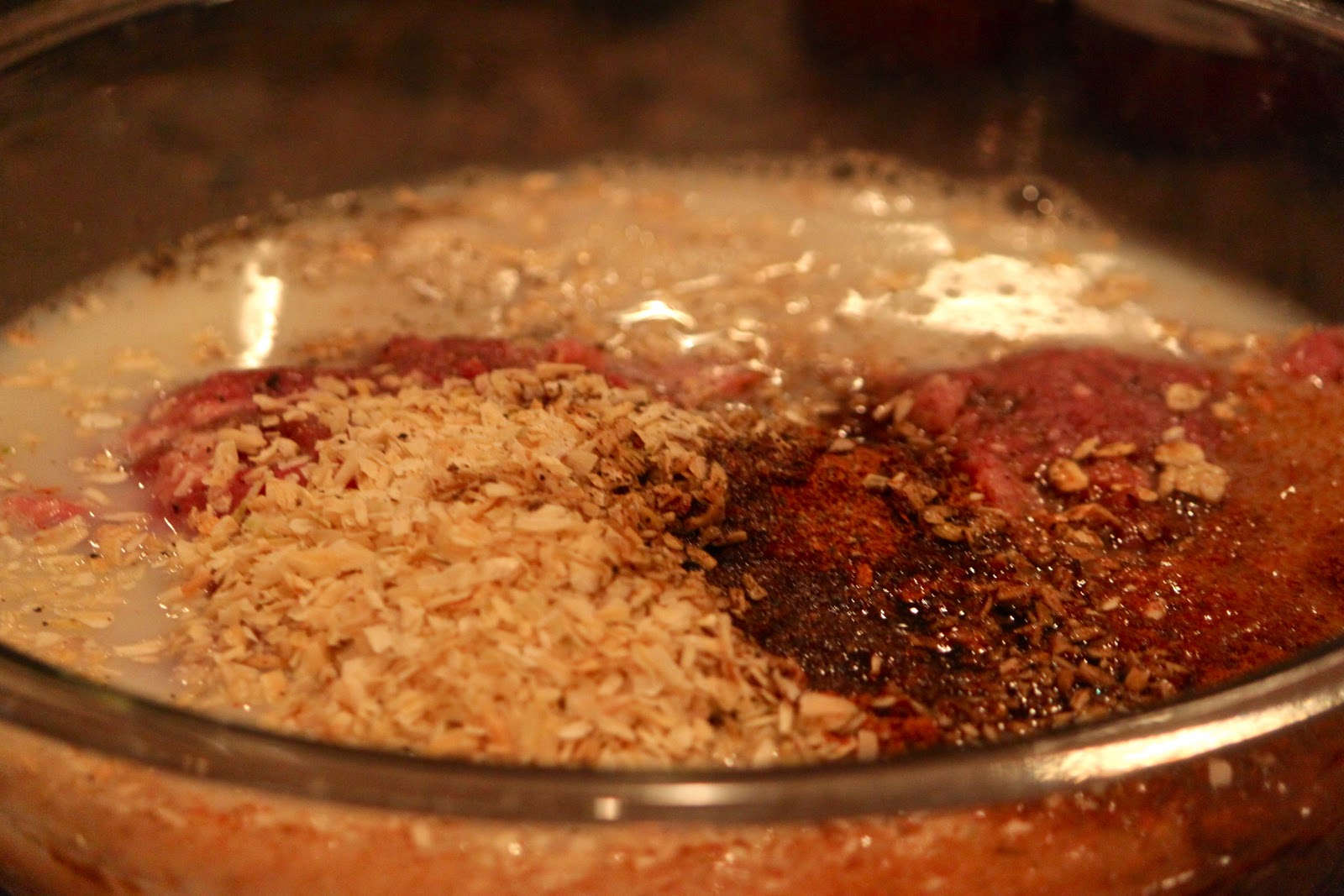 Preheat oven to 375F. In large mixing bowl, combine meat, milk, oatmeal, minced onion, 1 tsp. season salt and black pepper. I mix with my hands. But I’m sure a wooden spoon would work.