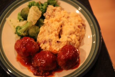 Bake for 35 minutes at 375F. While the meatballs baked, I pulled potatoes from the oven and mashed them. I don’t peel the potatoes. I mash the whole potatoes, adding a little skim milk, cream cheese, cheddar cheese, garlic, salt and pepper. I placed them in a baking dish and covered, putting them in the oven for the last 15 minutes the meatballs finished to warm up the potatoes, melting the cheeses and melding the flavors.