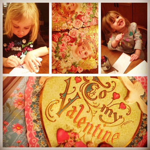 Last night after taking the girls and three friends to Tae Kwan Do we came home to complete our Valentine’s for the girls to bring to daycare today. They are far from homemade…more like TJ Maxx specials my mom found for us. But they are decorated with love.
