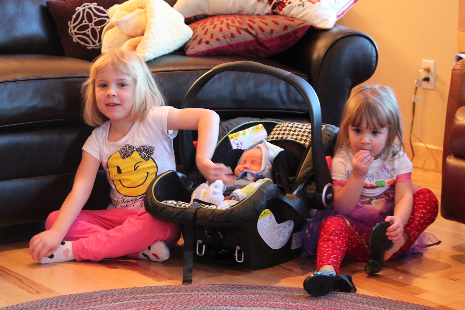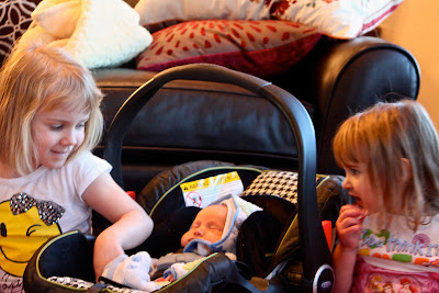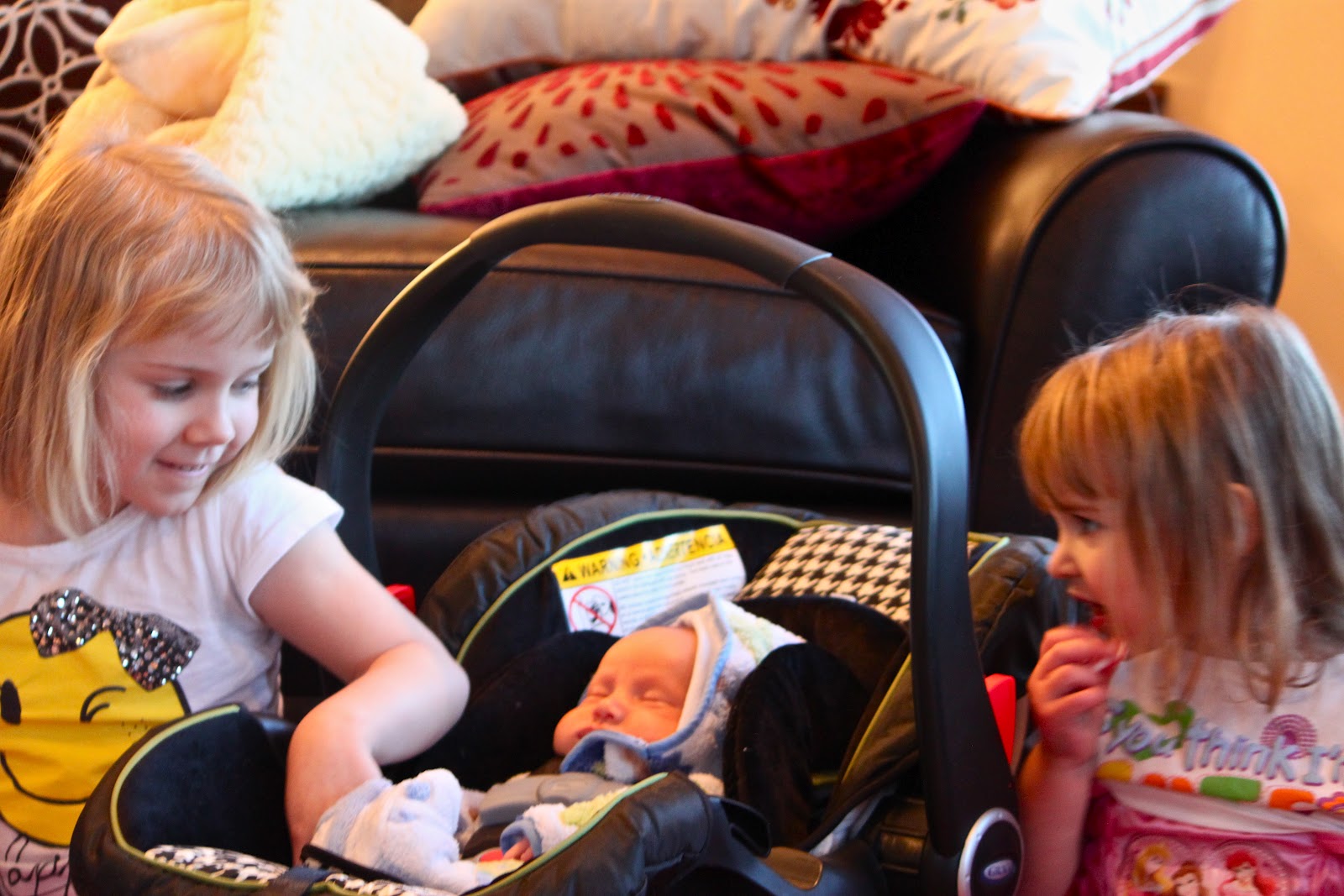 Our girls are in a baby stage. They care for their doll “babies” all the time. The babies go with us on outings and are cared for like their own. But the best babies are…real ones. And this afternoon our girls got a visit from a new “real” baby. Our local friends had their first born three weeks ago and stopped by this afternoon for a visit.