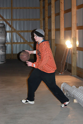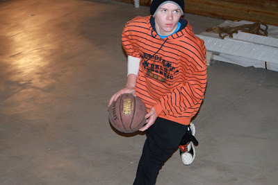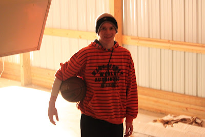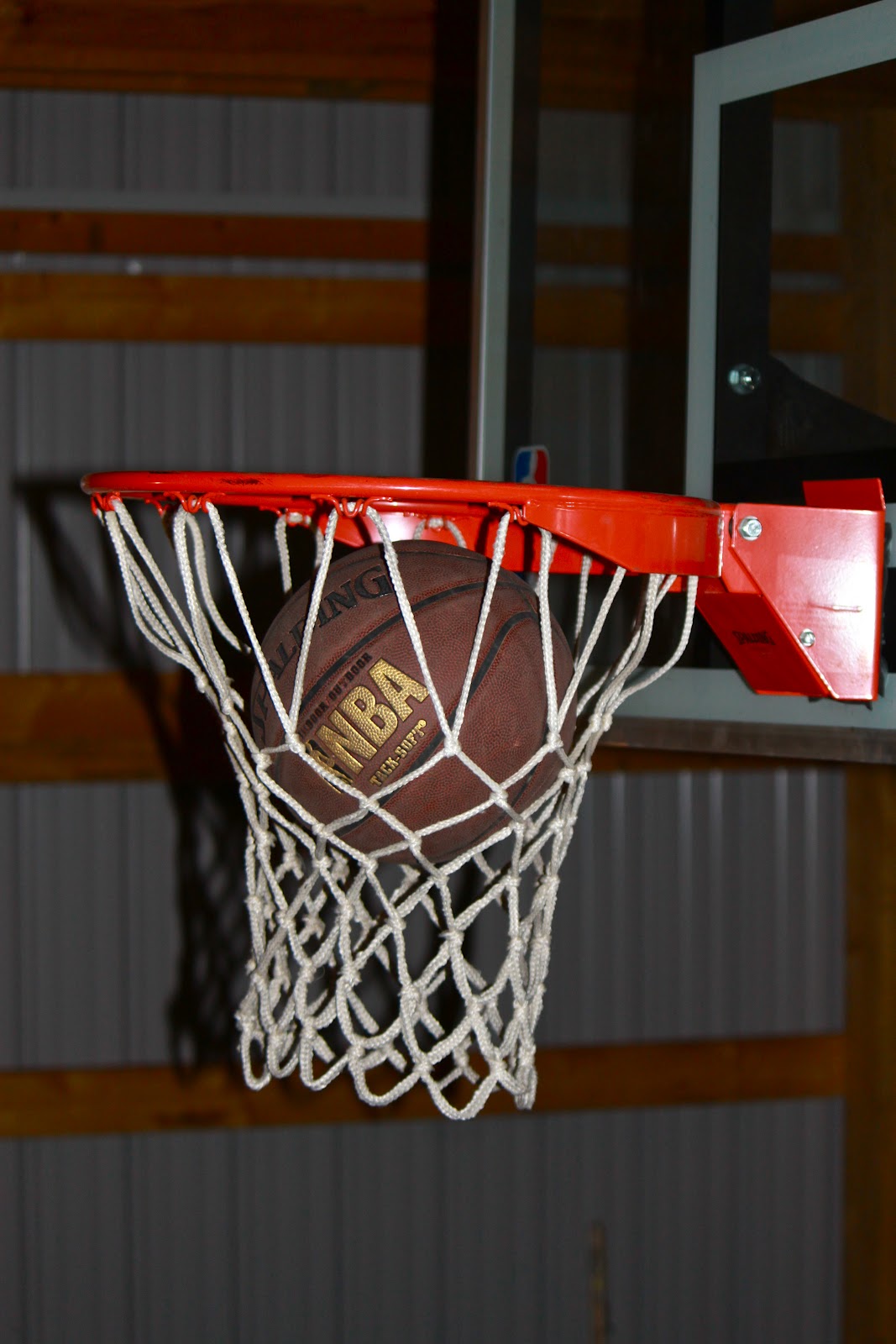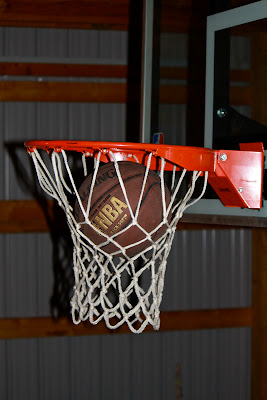 The ball goes in the basket in the barn.
