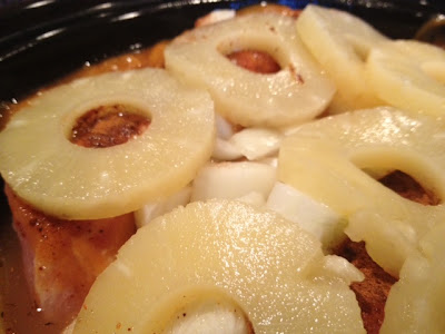 Lastly, I arranged pineapple on top of the roast and poured the pineapple juice from the can around the edges of the Crock-Pot.