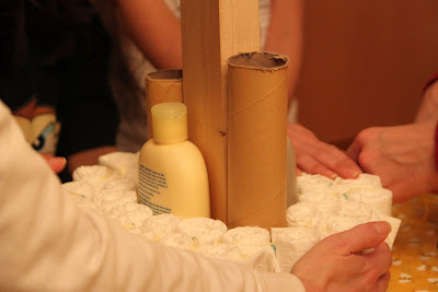 You asked and so I will tell you how we made the diaper cake for the shower a few of my friends and I threw for another friend and her new baby boy. The creative and crafty all the way to the uncrafty folks like myself can pull this project off with class and glamour, as glamourous as a tower of diapers in the shape of a tiered cake can be.