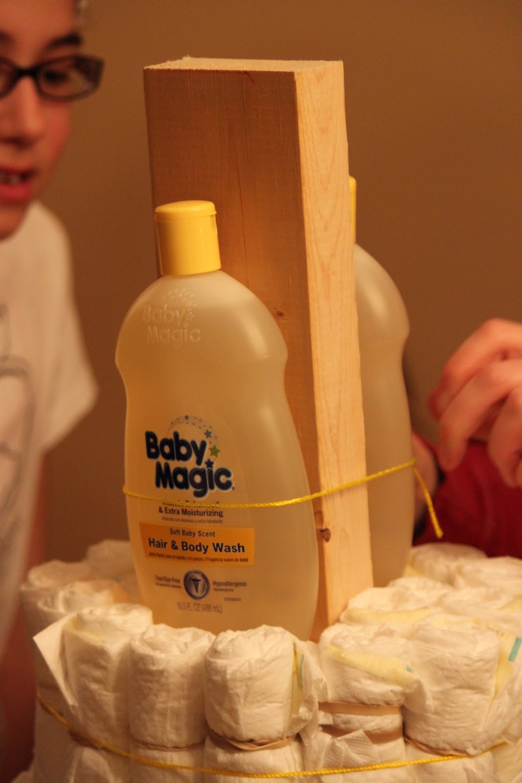 Diapers. You need at least 80 for an average size cake I was told by a few friends. I bought a case at Sam’s Club which was Size 2 and 186 count for our huge cake.