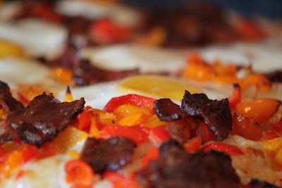 Evenly distribute the fried bell peppers and the bacon. Then crack the eggs in a fun fashion. Sprinkle with salt and pepper.