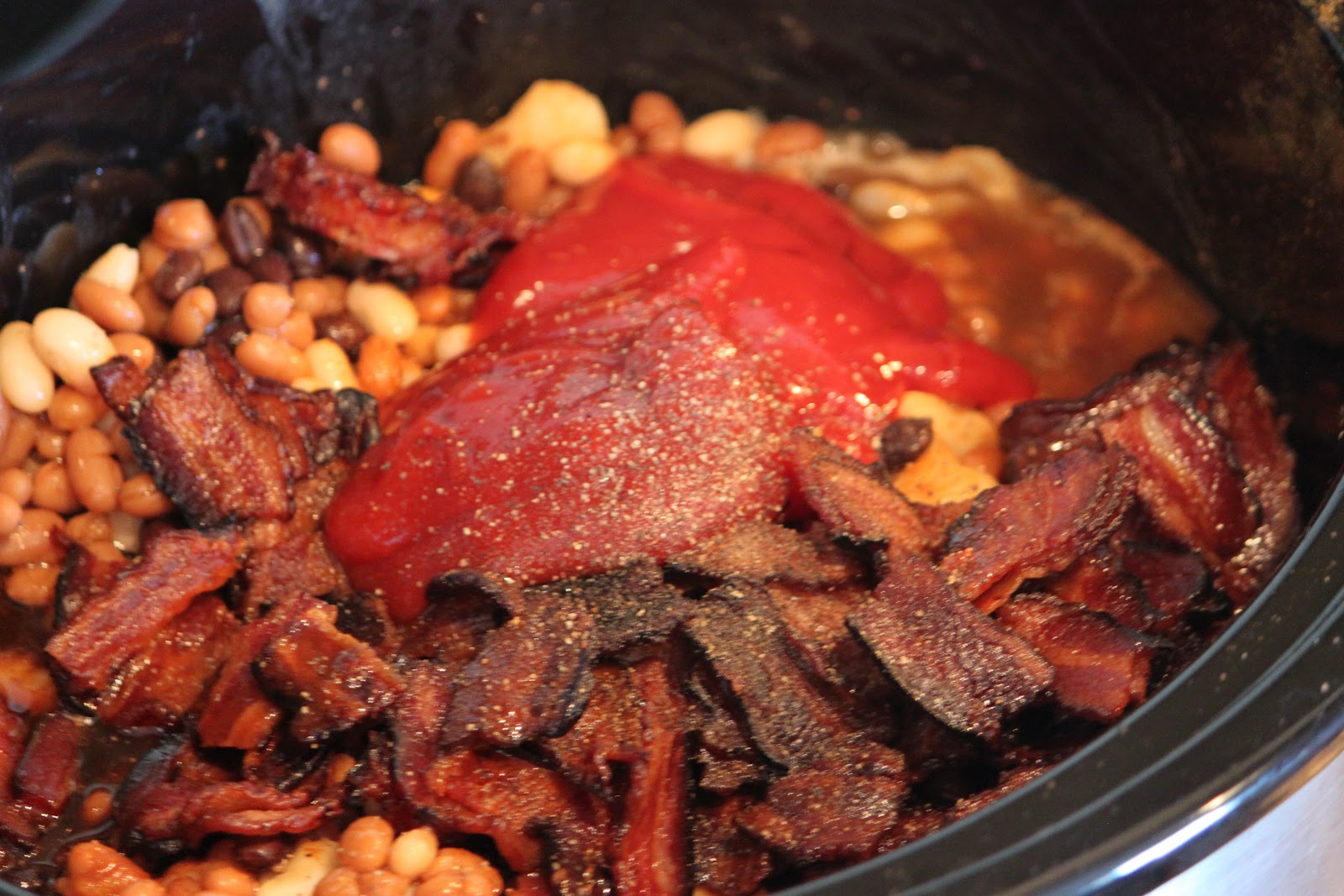 Add 1/2 cup ketchup to the bean mixture and 1/2 cup water.