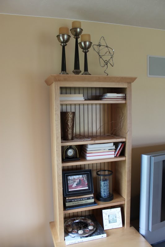 The little trick was to turn most of the books backward on the shelves, so the white pages were visible instead of the varying colored spines. This gives a more uniform look, making it feel less cluttered.