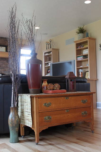 The sofa needed a table–something to ground it and feel less like it was floating in the middle of the room. Katie and I went on an exploration around the house and found her childhood dresser in the guest room. An original antique from our Grandpa Howard. Perfect!