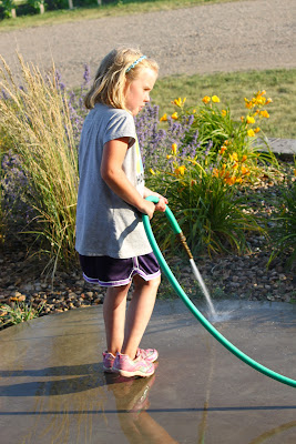 Miss E accidentally turned quickly to talk to me with the hose in hand. My screams were heard county wide I am sure. Hunter came barreling out of the house, faster than I have seen him move in a long time. He said my screams sounded like I was being robbed. No, just sprayed down with a hose on a hot day.