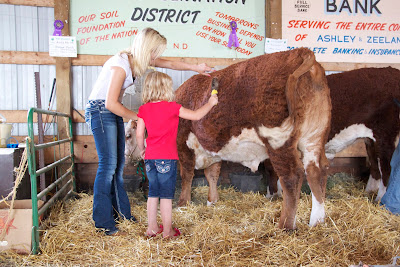 This past weekend was our county fair. We went out to the fair for lunch on Saturday. The girls and I each were wearing red flip flops, not thinking we would then be visiting the livestock barn. But showing was getting started and since I have a not-so secret desire for our girls to love livestock more than their daddy does and hopefully show in the county fair someday, we walked into the barn in our flip flops. Hunter’s classmate, Miss Lora showed Miss E and Miss A the Hereford steers she and her brother were showing. She offered to teach the girls to brush the cattle while her brother was giving drying them and preparing them to be “pretty” for showing.