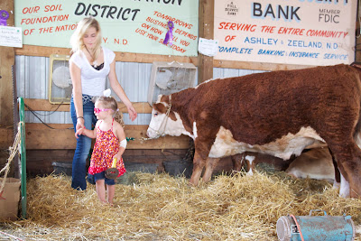 Adored with red flip flips in the straw, white hair bow and pink sunglasses, Miss A was ready for her turn but she was done with the Hereford steer. She led Lora to the dairy cows.
