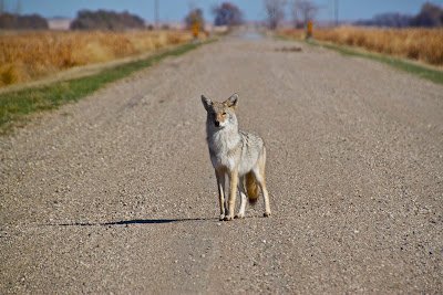 In the background of the photo there is another figure on the road. It was a dead coyote. I believe this one was hanging around because of the dead coyote. She had little fear of me. She seemed to be protecting her lost friend.