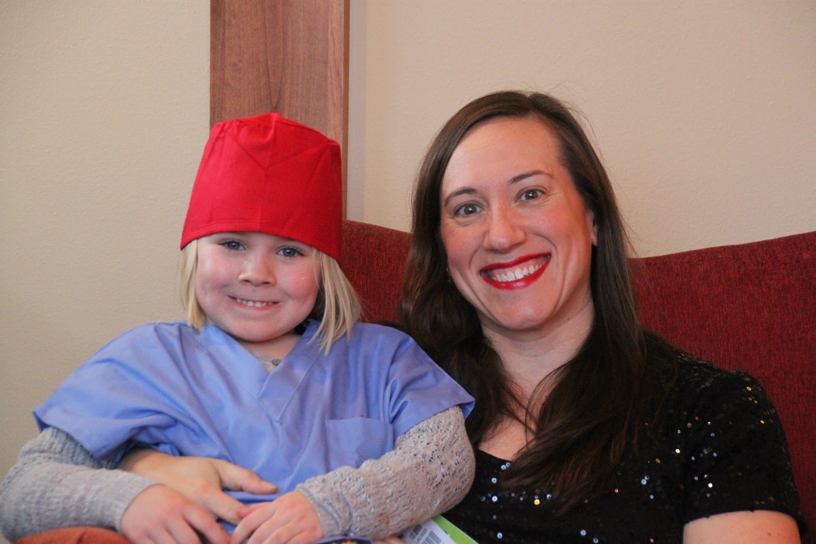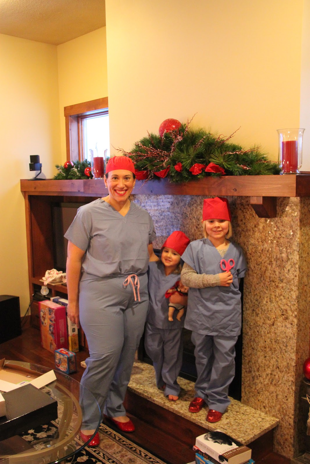 Since Miss E broke her arm earlier this fall, she has announced she wants to be a “bone doctor”. Miss A, not to be outdone by her sister, announced she wants to be a “mommy doctor”. Dr. Lori captured their dreams when they both opened boxes of scrubs that match hers that she wears in the surgical room, complete with red hats.