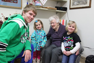 We ate breakfasts at my grandparent’s house a few mornings where four generations sat together, laughing and telling stories. We visited my Great-Great Aunt Iris (in above picture). The girls fed the cows with Uncle Jim. A 70 mile road trip to two different days to see Hunter play in a holiday tournament broke up the days. They won the first game and lost the second game by two points. The girls and I had a visit to the mall in big town, Fargo and lunch with good friends.