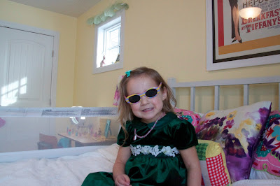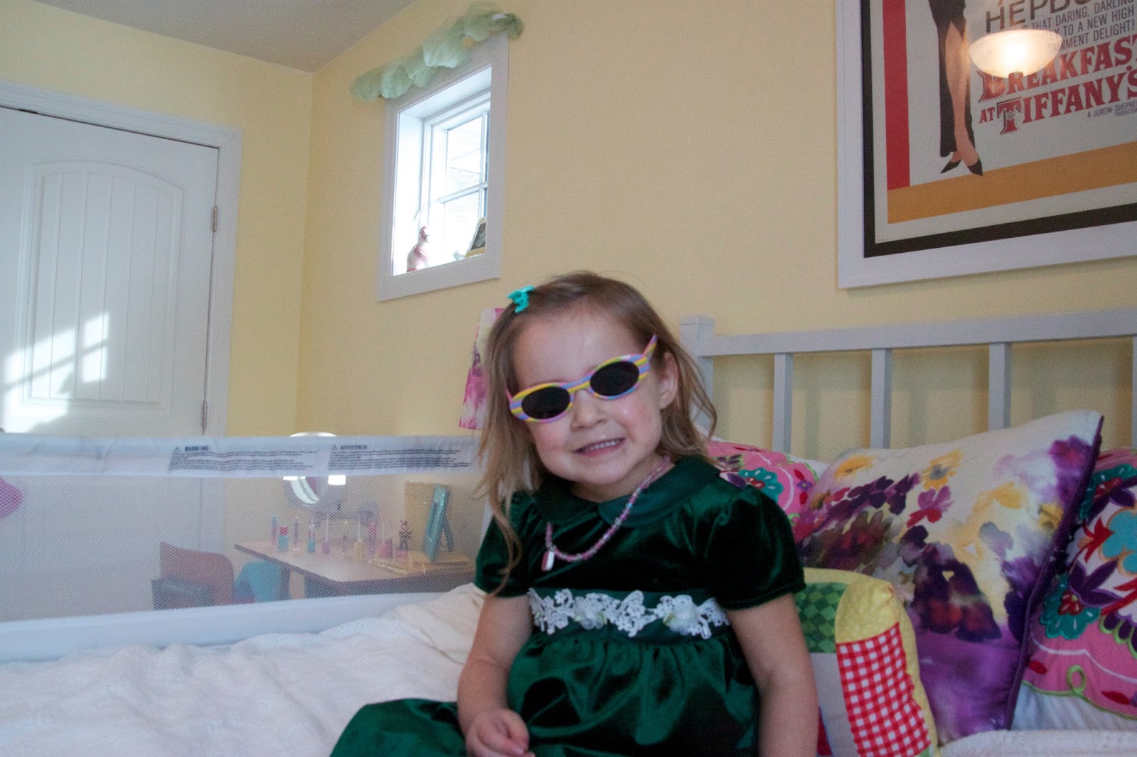 Yeah, see that poster above the bed? You may think it says “Breakfast at Tiffany’s” but it actually says “No jumping on the bed.” Don’t believe me? Just ask Anika. She’ll even point to the words Uncle Mike showed her.